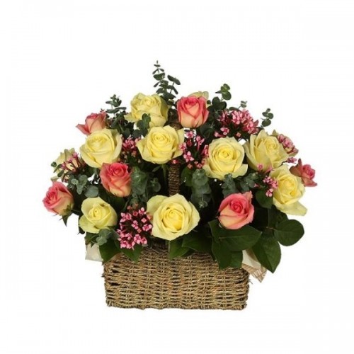 계절꽃과 다양한 소재로 제작한 혼합 꽃바구니 상품입니다.